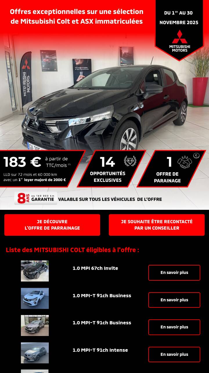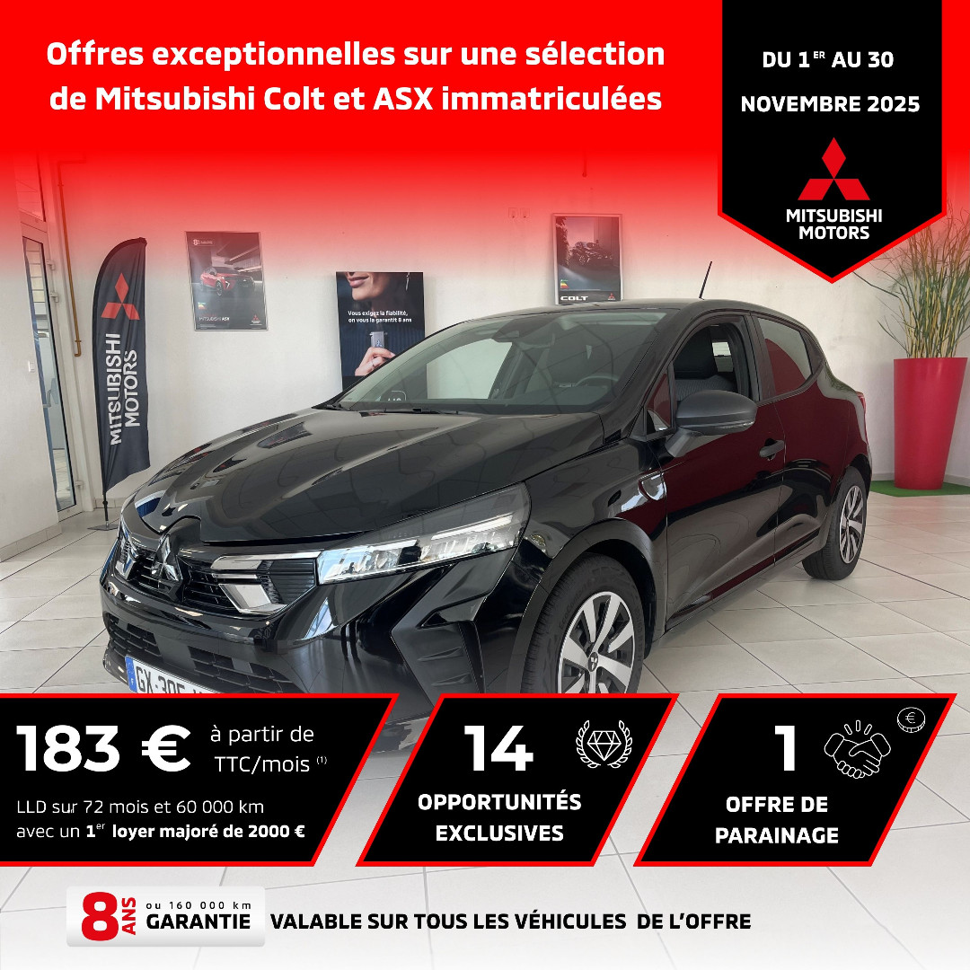 (1) Exemple pour cette MITSUBISHI COLT Invite avec peinture métallisée incluse, neuve immatriculée le 26/06/2024 : 1er loyer majoré de 2 000 € suivi de 71 loyers mensuels de 183 €. Location Longue Durée (LLD), hors assurances et prestations facultatives, de 72 mois et 60 000 km maximum. Sous réserve d’étude et d’acceptation par DIAC, agissant sous la marque commerciale Mobilize Financial Services, SA au capital de 415 100 500 € - Siège social : 14 avenue du Pavé Neuf 93160 Noisy-le-Grand - SIREN 702 002 221 RCS Bobigny, n° Orias 07 004 966 consultable sur www.orias.fr. En fin de contrat, restitution du véhicule chez votre concessionnaire avec paiement des frais de remise à l’état standard et des kilomètres supplémentaires. Offre réservée aux particuliers, valable sur une sélection de Mitsubishi Colt et Mitsubishi ASX en stock chez Cachet Giraud pour toute commande passée entre le 01/11/2025 et le 30/11/2025, dans la limite des stocks disponibles et non cumulables avec d’autres offres en cours (voir conditions de l’offre en concession). Garantie : 8 ans ou 160 000 km, au 1er des 2 termes échu, selon conditions générales de vente. 5 ans de garantie constructeur + 3 ans de garantie importateur. M MOTORS AUTOMOBILES FRANCE SAS au capital de 10 000 000 € - RCS PONTOISE n° 428 635 056 - 1 avenue du Fief 95067 Cergy- Pontoise Cedex. *Dépassez vos ambitions.