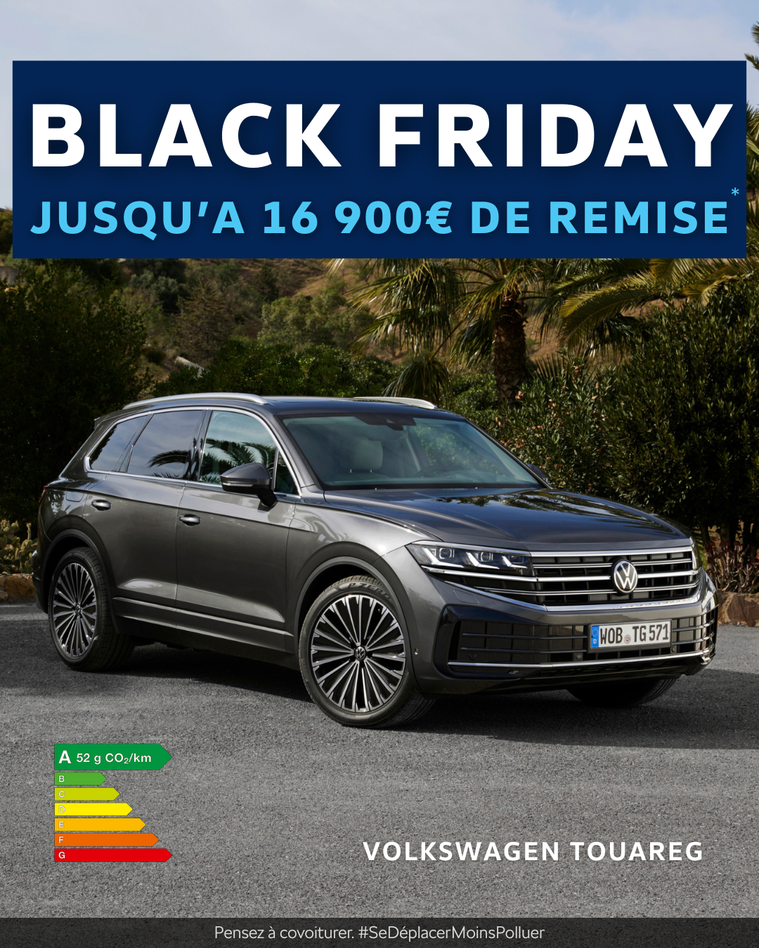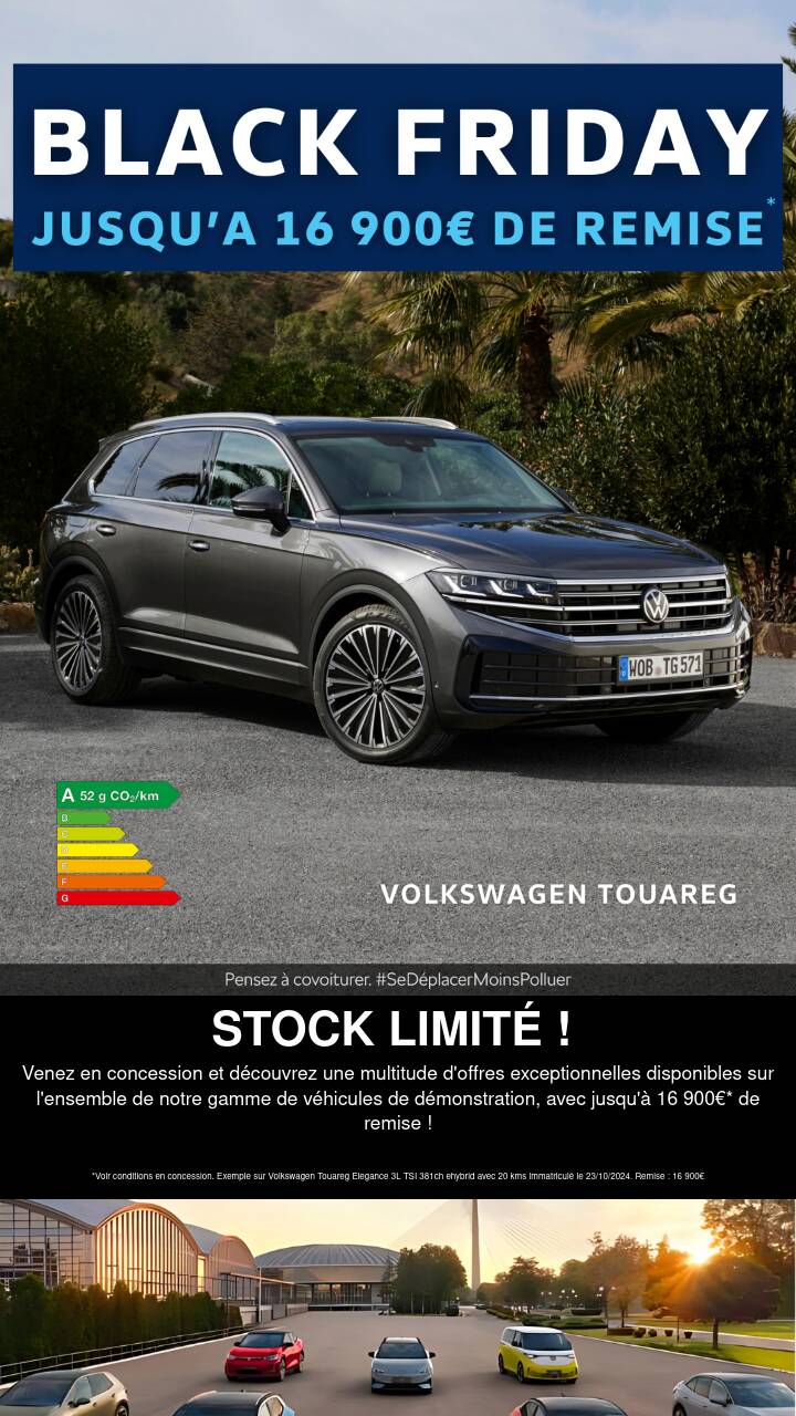 *Voir conditions en concession. Exemple sur Volkswagen Touareg Elegance 3L TSI 381ch ehybrid avec 20 kms immatriculé le 23/10/2024. Remise : 16 900€