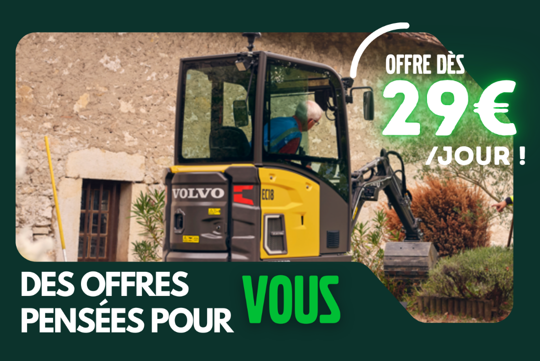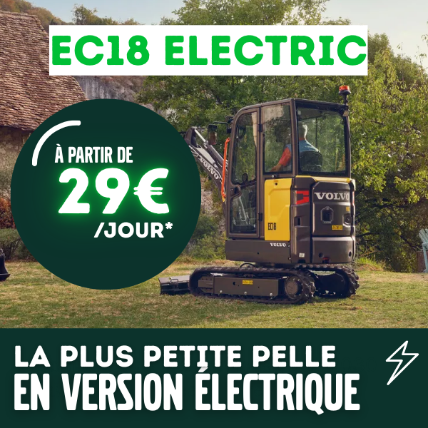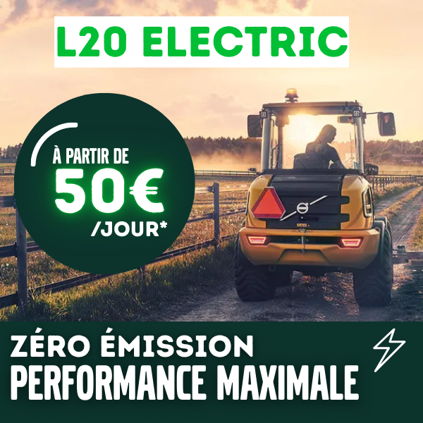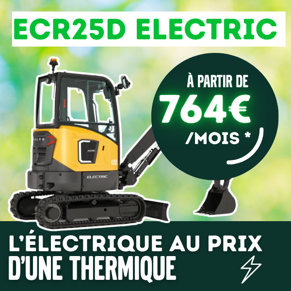 *Offre valable du 01/09/2025 au 31/12/2025 pour une location longue durée 84 mois / 4000h - sur base d’une utilisation de 600h/an max (équivalent 1000h d’un matériel thermique) - d’une chargeuse L20 Electric / mini-pelle EC18 Electric / mini-pelle ECR25 Electric VOLVO CE - Hors chargeur rapide - Machine configuration standard - Sous réserve d’acceptation du financement par notre organisme agréé - Visuel non contractuel.
