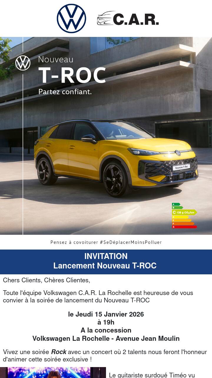 Toute l'équipe Volkswagen C.A.R. La Rochelle est heureuse de vous convier à la soirée de lancement du Nouveau T-ROC