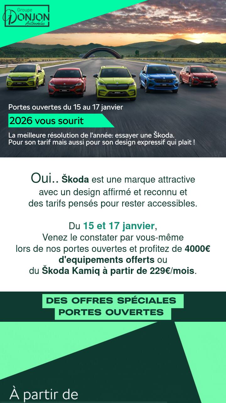 ⁽¹⁾ Location longue durée sur 37 mois. 37 loyers de 229€. Remise Škoda de 7 000€ déduite du prix catalogue. Offre valable du 01 janvier au 31 janvier 2026 pour toute immatriculation avant le 30/06/2026.