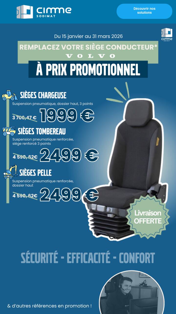 *Offre valable du 15 janvier au 31 mars 2026, sur une sélection de sièges, sous réserve de compatibilité machine. La date de passage de commande fait foi. Livraison offerte pendant la durée de l’opération. Les prix indiqués sont HT et concernent les matériels suivants : chargeuses L60H, L70H, L90H, L110H, L120H, L180H, L220H, L260H, L350H / tombereaux A25F, A30F, A35F, A40F, A25G, A30G, A35G, A40G, A45G, A60H / pelles EC200E, EC250E, EC480E, EC750E. D’autres offres promotionnelles sont disponibles, contactez-nous pour plus de détails.