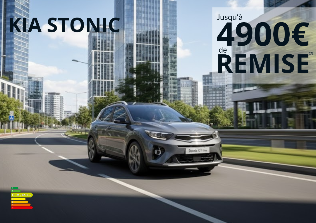 (2) Remise de 4 900 € valable du 01/02/2026 au 28/02/2026 pour l’achat de ce KIA STONIC GT-LINE 1.0 T-GDi 100 ch DCT MY25B (Immatriculation : HF-999-LD, Date de première immatriculation : 08/09/2025). Prix de vente TTC remisé : 24 300,00 €. Le prix inclut les options et accessoires, notamment le Bac de coffre d'une valeur de 115,00 € TTC. Le prix s'entend hors frais de mise à la route, certificat d'immatriculation et éventuel malus écologique. Véhicule de démonstration disponible à partir du 09/03/2026 sur le lieu de stockage : Labège. Offre réservée aux particuliers, non cumulable avec d’autres promotions en cours, dans la limite de ce seul exemplaire disponible.