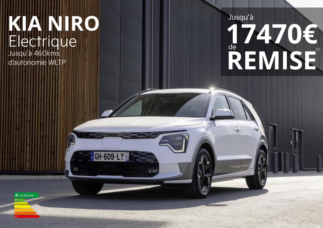 (1) Remise de 17 470 € valable du 01/02/2026 au 28/02/2026 pour l’achat de ce KIA NIRO EV 204 ch ACTIVE (Immatriculation : GS-503-YA, Date de première immatriculation : 08/12/2023). Prix de vente TTC remisé : 29 890,00 €. Le prix inclut les options et accessoires (dont Bac de coffre d'une valeur de 109,00 € TTC). Le prix s'entend hors frais de mise à la route, certificat d'immatriculation et éventuel malus écologique. Véhicule de démonstration disponible immédiatement sur le lieu de stockage : Muret.Offre réservée aux particuliers, non cumulable avec d’autres promotions en cours, dans la limite de ce seul exemplaire disponible.