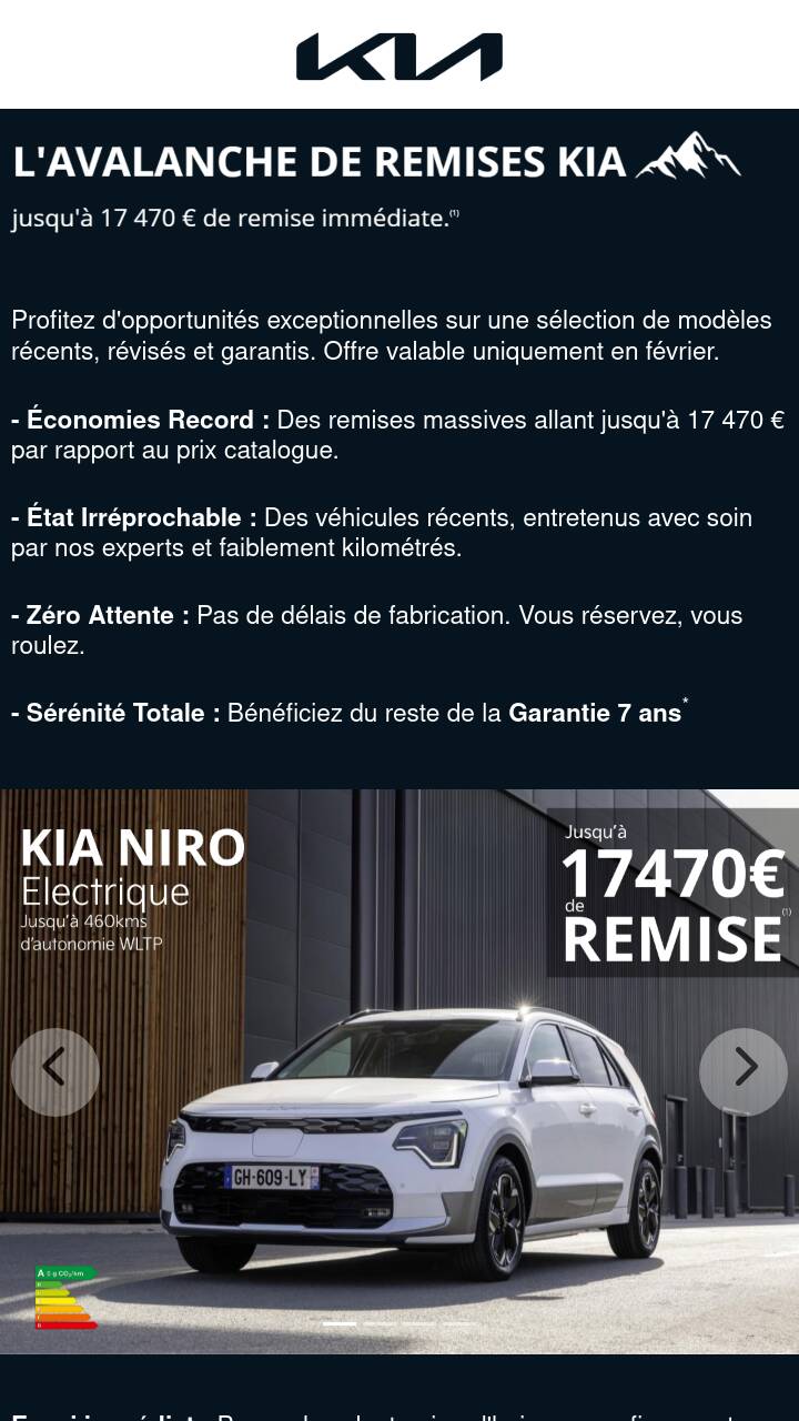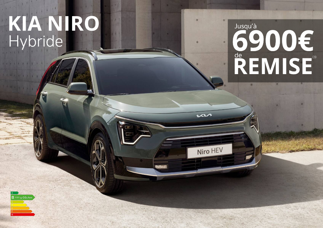 (3) Remise de 6 900 € valable du 01/02/2026 au 28/02/2026 pour l’achat de ce KIA NIRO HEV PREMIUM (Immatriculation : HC-558-PC, Date de première immatriculation : 24/03/2025). Prix de vente TTC remisé : 32 690,00 €. Le prix s'entend hors frais de mise à la route, certificat d'immatriculation et éventuel malus écologique. Véhicule de démonstration avec 35 000 km au compteur, disponible à partir du 01/03/2026 sur le lieu de stockage : Toulouse. Offre réservée aux particuliers, non cumulable avec d’autres promotions en cours, dans la limite de ce seul exemplaire disponible.