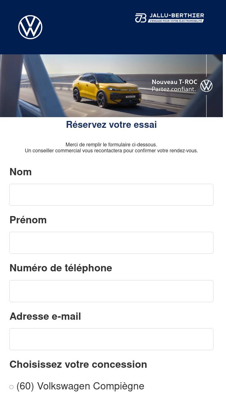 Ce message vous est envoyé par le Groupe Jallu-Berthier, responsable du traitement des données. Vos données font l’objet d’un traitement automatisé, elles sont nécessaires pour nous permettre de vous contacter, ou dans le cadre d’opérations commerciales et marketing, y compris par e-mail si vous avez donné votre accord (que vous pouvez retirer à tout moment). Ces données pourront être transmises au Groupe Jallu-Berthier , Volkswagen Group France, ses filiales, son réseau de distributeurs et réparateurs agréés Volkswagen France, toute société du groupe Volkswagen AG et d’éventuels partenaires commerciaux. Ces informations ne seront pas transmises hors du territoire de l’Union Européenne et ne seront pas conservées au-delà de 3 ans à compter du dernier contact actif de votre part.
