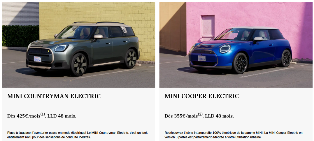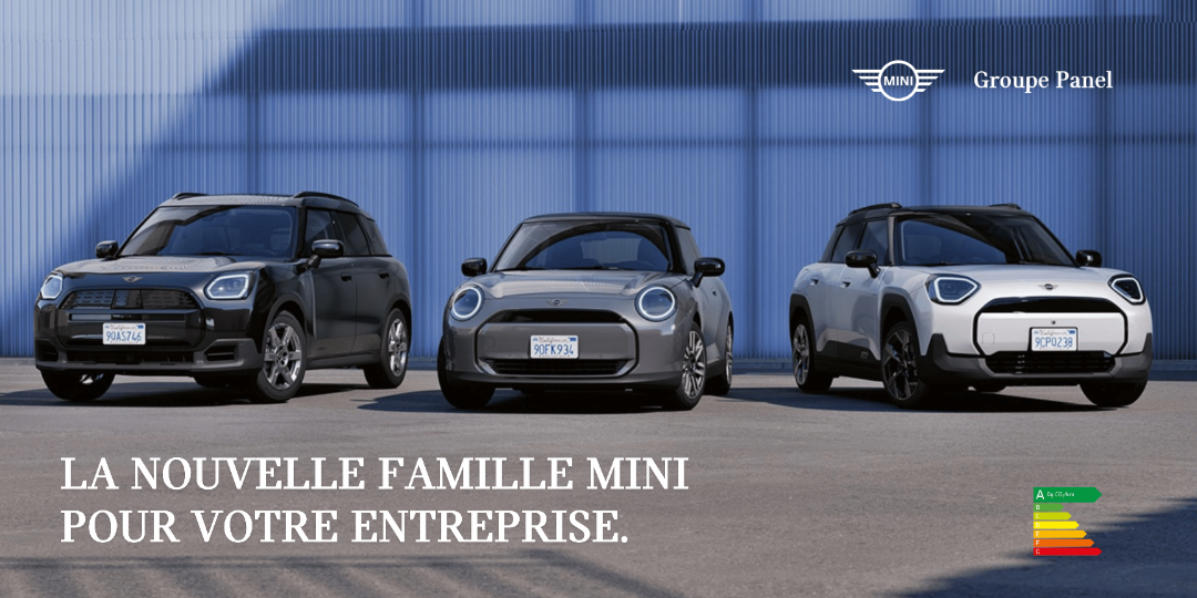 (1) MINI Countryman E Classic XS 204 ch BVA 5 portes. 48 loyers linéaires : 427,78 €/mois hors coûts d’immatriculation. Location Longue Durée sur 48 mois et pour 40000 km incluant l'Entretien, l'Assistance 24h/24 et la Garantie Perte Financière. Tarif sous réserve des modifications du tarif constructeur en vigueur, assurances ou variation des taux financiers et taxes. Montants TTC dont TVA 20 %. Offre réservée aux professionnels pour toute commande d’une MINI Countryman E Classic XS 204 ch BVA 5 portes dans les agences participantes avant le 30/06/2025 et sous réserve d'acceptation de votre dossier par Alphabet France Fleet Management SAS au capital de 6 295 380, 25 € - 5, rue des Hérons à Montigny-Le-Bretonneux, 78182 Saint-Quentin-en-Yvelines Cedex - RCS Versailles 338 708 076 - N° TVA Intracommunautaire FR 61 338 708 076 - N°ORIAS : 13009206 - Téléphone : 01.30.47.10.66. Prestation Entretien & Assistance souscrite auprès d’Alphabet. La Garantie Perte Financière est accordée selon les conditions prévues au contrat n°7.610.101 souscrit auprès de MMA IARD Assurances Mutuelles, société d’assurance mutuelle à cotisations fixes, siège social : 14 bd Marie et Alexandre Oyon, 72030 Le Mans Cedex 9, 775 652 126 RCS Le Mans, et MMA IARD, SA au capital de 537 052 368 €, siège social : 14 bd Marie et Alexandre Oyon, 72030 Le Mans Cedex 9, 440 048 882 RCS Le Mans, sociétés appartenant au groupe COVEA et régies par le Code des assurances. MMA et Alphabet sont soumis au contrôle de l’Autorité de Contrôle Prudentiel et de Résolution- 4 Place de Budapest CS 92459 75436 Paris Cedex 09. Le véhicule présenté comporte des équipements en option, le loyer ainsi que le détail des caractéristiques techniques du véhicule sont disponibles auprès d'Alphabet. Consommation d'énergie électrique : 15,7 – 17,4 kWh/ 100 km. CO₂ combinée : 0 g/km. Autonomie électrique : 423 - 462 km - Norme WLTP. Depuis le 01/09/2018, les véhicules légers neufs sont réceptionnés en Europe sur la base de la procédure d’essai harmonisée pour les véhicules légers (WLTP), procédure d’essai permettant de mesurer la consommation de carburant et les émissions de CO₂, plus réaliste que la procédure NEDC précédemment utilisée.