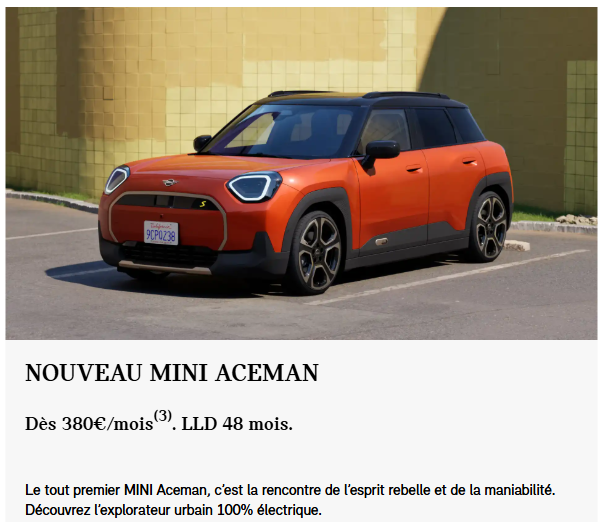 (3) MINI Aceman E Classic XS 184 ch BVA 5 portes. 48 loyers linéaires : 381,91 €/mois hors coûts d’immatriculation. Location Longue Durée sur 48 mois et pour 40000 km incluant l'Entretien, l'Assistance 24h/24 et la Garantie Perte Financière. Tarif sous réserve des modifications du tarif constructeur en vigueur, assurances ou variation des taux financiers et taxes. Montants TTC dont TVA 20 %. Offre réservée aux professionnels pour toute commande d’une MINI Aceman E Classic XS 184 ch BVA 5 portes dans les agences participantes 30/06/2025 et sous réserve d'acceptation de votre dossier par Alphabet France Fleet Management SAS au capital de 6 295 380, 25 € - 5, rue des Hérons à Montigny-Le-Bretonneux, 78182 Saint-Quentin-en-Yvelines Cedex - RCS Versailles 338 708 076 - N° TVA Intracommunautaire FR 61 338 708 076 - N°ORIAS : 13009206 - Téléphone : 01.30.47.10.66. Prestation Entretien & Assistance souscrite auprès d’Alphabet. La Garantie Perte Financière est accordée selon les conditions prévues au contrat n°7.610.101 souscrit auprès de MMA IARD Assurances Mutuelles, société d’assurance mutuelle à cotisations fixes, siège social : 14 bd Marie et Alexandre Oyon, 72030 Le Mans Cedex 9, 775 652 126 RCS Le Mans, et MMA IARD, SA au capital de 537 052 368 €, siège social : 14 bd Marie et Alexandre Oyon, 72030 Le Mans Cedex 9, 440 048 882 RCS Le Mans, sociétés appartenant au groupe COVEA et régies par le Code des assurances. MMA et Alphabet sont soumis au contrôle de l’Autorité de Contrôle Prudentiel et de Résolution - 4 Place de Budapest CS 92459 75436 Paris Cedex 09. Le véhicule présenté comporte des équipements en option, le loyer ainsi que le détail des caractéristiques techniques du véhicule sont disponibles auprès d'Alphabet. Consommation d'énergie électrique : 14,1 – 14,7 kWh/ 100 km. CO₂ combinée : 0 g/km. Autonomie électrique : 299 - 309 km - Norme WLTP. Depuis le 01/09/2018, les véhicules légers neufs sont réceptionnés en Europe sur la base de la procédure d’essai harmonisée pour les véhicules légers (WLTP), procédure d’essai permettant de mesurer la consommation de carburant et les émissions de CO₂, plus réaliste que la procédure NEDC précédemment utilisée.