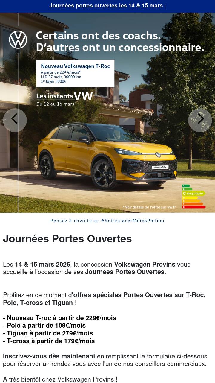Profitez en ce moment d'offres spéciales Portes Ouvertes sur T-Roc, Polo, T-cross et Tiguan !