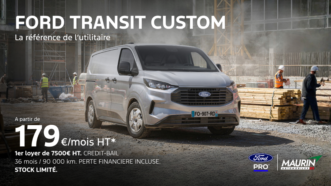 *Offre crédit bail ballon d'un transit Custom 280 L1H1 Trend 2.0L EcoBlue 110ch BVM6 sur 36 mois / 90 000 km perte financiere incluse. Carte grise non incluse. Montant de l'option d'achat en cas de levée de l'option : 16841€ HT avec un 1er loyer de 7500€ HT puis 35 loyers de 197€ HT, coût total si achat : 30606 € HT. Si acceptation Ford Crédit - 1 rue du 1er Mai 92752 Nanterre - SIREN 392 315 776 RCS Nanterre, n° ORIAS : 07 009 071. Offre non cumulable reservée aux professionnels valable du 01/03/2026 au 31/03/2026 dans le réseau Ford participant. Dans la limite des stocks disponibles en concession participante. Modèle présenté : mêmes conditions.