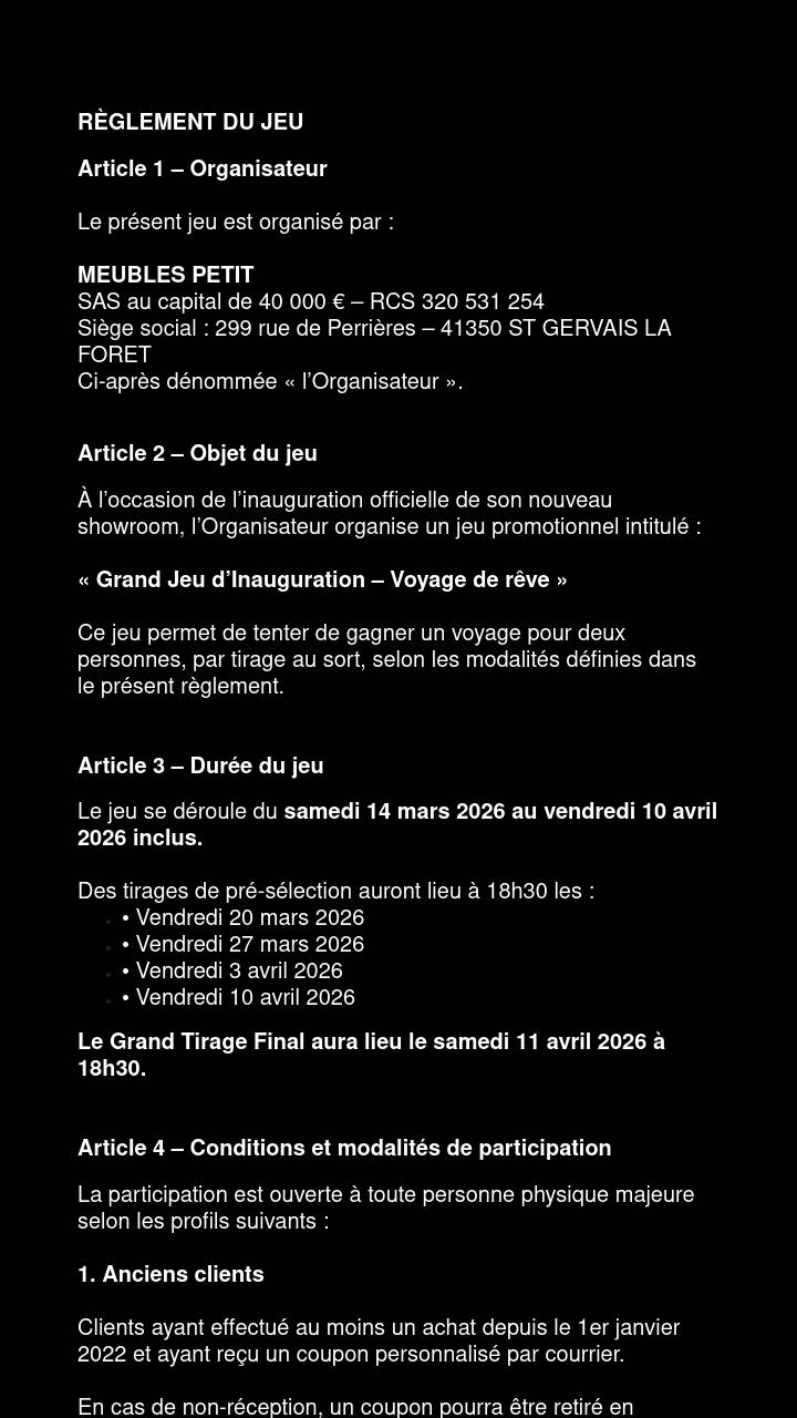 Le règlement est disponible gratuitement en magasin pendant toute la durée de l’opération, sur le site internet www.meublespetit.fr et sur simple demande par email à [email protected]