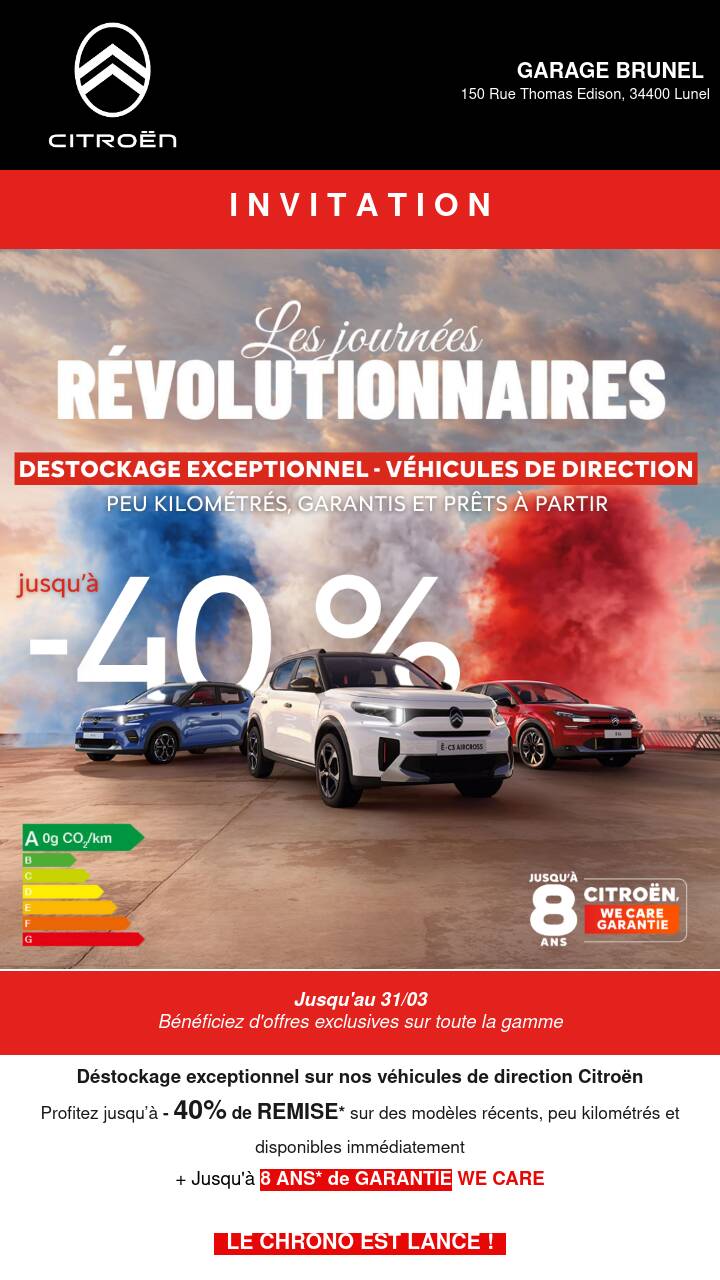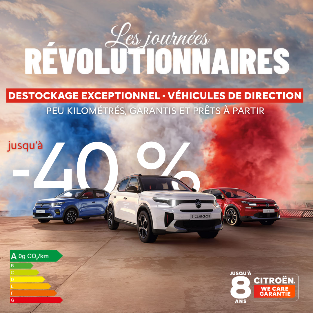 Déstockage exceptionnel sur nos véhicules de direction Citroën Profitez jusqu’à - 40% de REMISE* sur des modèles récents, peu kilométrés et disponibles immédiatement + Jusqu'à8 ANS* de GARANTIEWE CARE LE CHRONO EST LANCE !