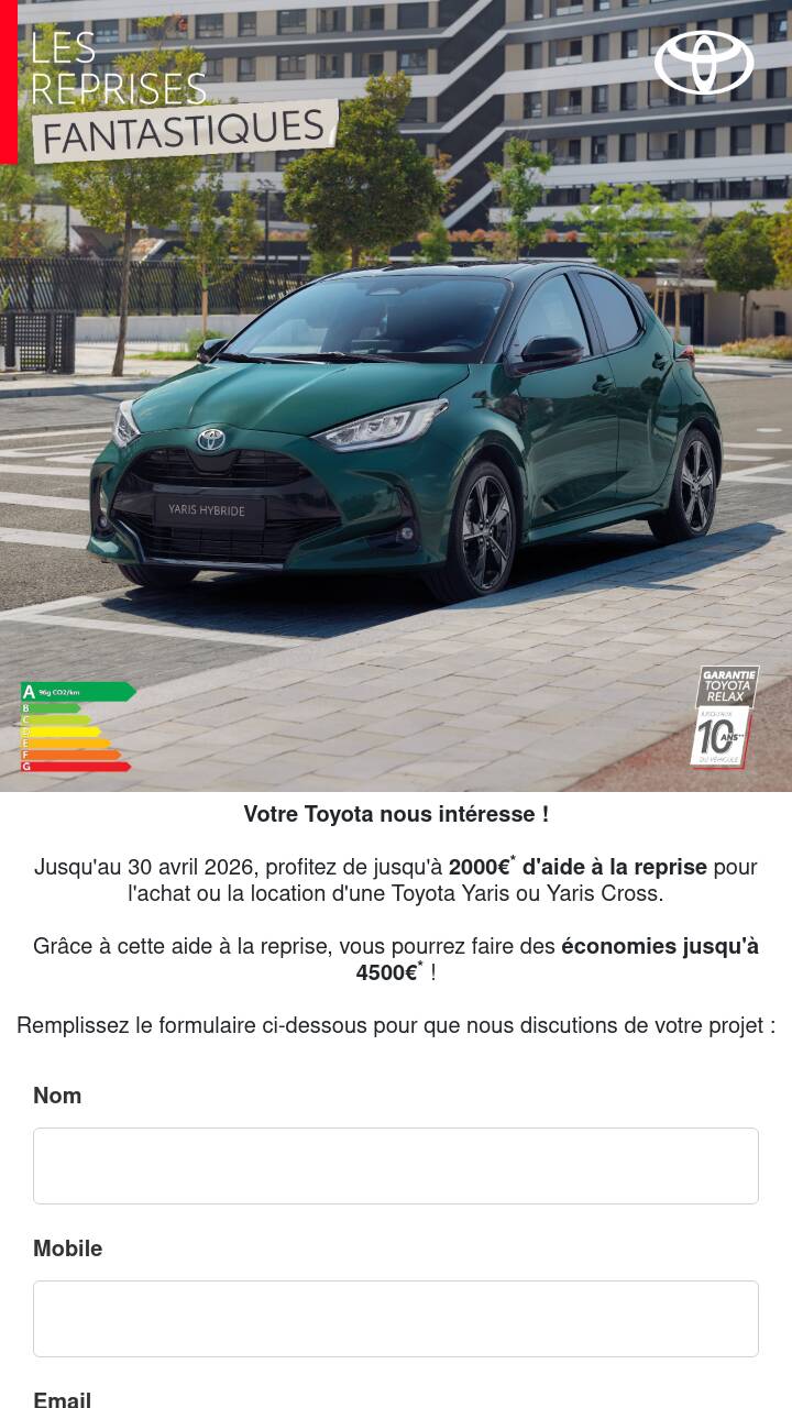 Jusqu'au 30 avril 2026, profitez de jusqu'à 2000€* d'aide à la reprise pour l'achat ou la location d'une Toyota Yaris ou Yaris Cross.