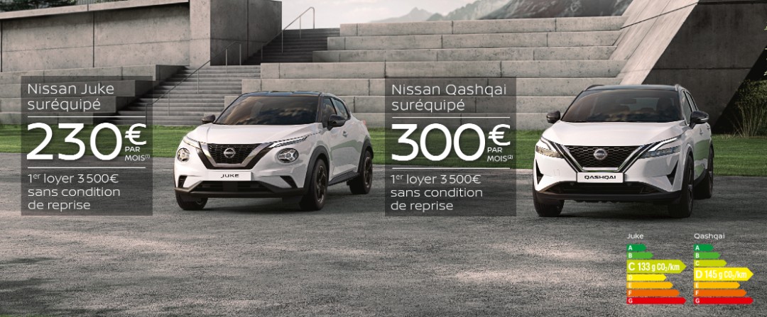 (1) Pour un Nissan Juke série spéciale neuf, 1er loyer de 3 500€, puis 48 loyers de 230€ (2) Pour un Nissan Qashqai Mild Hybrid 140 ch série spéciale neuf, 1er loyer de 3 500€ puis 48 loyers de 300€. Location longue Durée 49 mois, 40 000km maximum. Restitution du véhicule chez votre Concessionnaire en fin de contrat avec paiement des frais de remise en état standard et des kilomètres supplémentaires. Sous réserve d’acceptation par Diac. Offres réservées aux particuliers, non cumulables avec d’autres offres, valables jusqu’au 31/10/2023, dans la limite des stocks disponibles, chez les Concessionnaires NISSAN participants. NISSAN WEST EUROPE SAS : nissan.fr Consommations gamme cycle combiné (l/100km) : Juke : 5,8 ; Qashqai : 6,4