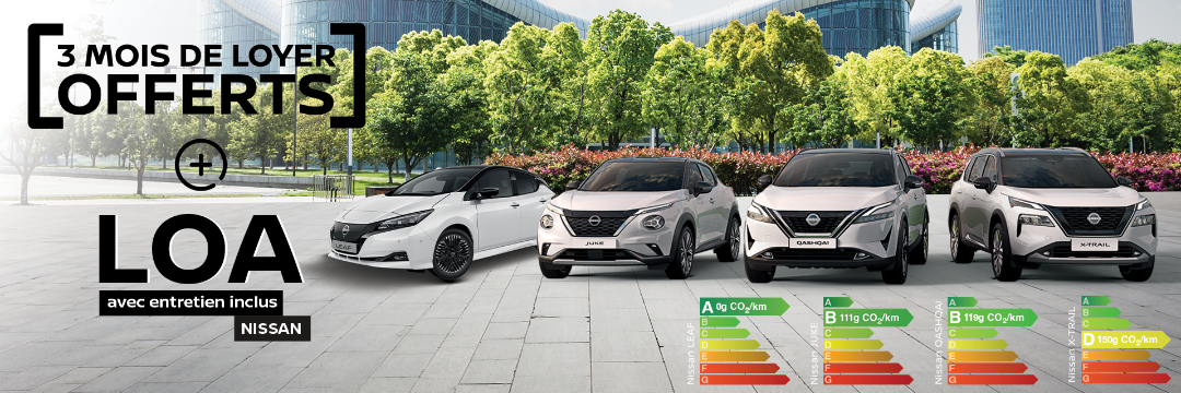 (2) 3 loyers offerts par Nissan, après paiement du premier loyer majoré, pour toute souscription d’un contrat de location longue durée ou d’une location avec option d’achat du 1er Février au 31 Mars 2024, auprès de Nissan Financial Services pour un véhicule d’occasion éligible de plus d’un an et de moins de 8 ans. Les 2ème, 3ème et 4ème loyers de votre nouveau contrat ne vous seront pas prélevés. Offre réservée aux particuliers dans la limite des stocks disponibles et valables jusqu’au 31 Mars 2024 chez votre distributeur Nissan. Sous réserve d’étude et d’acceptation par DIAC S.A. établissement de crédit et intermédiaire d'assurances, au capital de 415 100 500 euros - Siège social : 14 avenue du Pavé Neuf - 93168 Noisy-le-Grand Cedex – RCS Bobigny : 702 002 221 - Orias n° 07 004 966 - http://www.orias.fr/Nissan Financial Services est une marque commerciale désignant les produits et services proposés par DIAC. Elle est déposée par Nissan Motor Co. et utilisée par DIAC en France. »