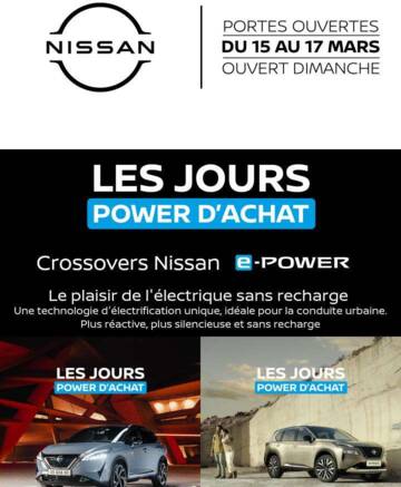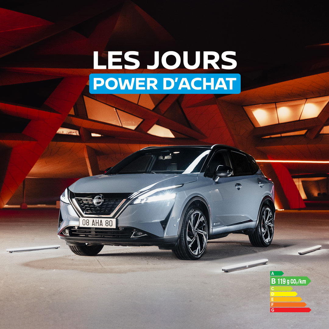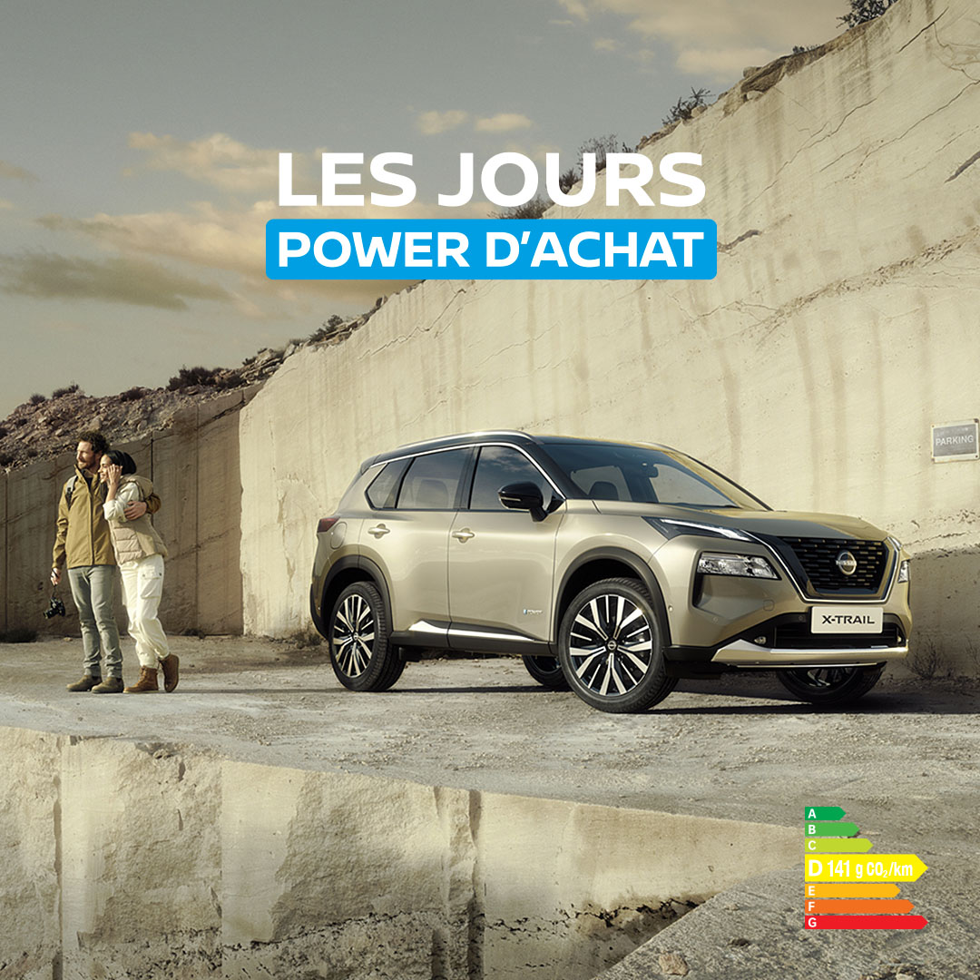 (1) Pour un Nissan Qashqai e-POWER 190ch N-Connecta neuf en Location Longue Durée 49 mois, 40 000 km, 1er loyer 5 500€ puis 48 loyers de 199€. Modèle présenté : Nissan Qashqai e-POWER 190 ch TEKNA+ neuf options peinture métallisée spéciale + coloris bi-ton, 1er loyer 5 500€ puis 48 loyers de 413€. 500 QASHQAI disponibles. Restitution du véhicule chez votre Concessionnaire en fin de contrat avec paiement des frais de remise en état standard et des kilomètres supplémentaires. Sous réserve d’acceptation par Diac. Nissan X-Trail présenté : Version spécifique. Offre réservée aux particuliers, non cumulable avec d’autres offres, valable jusqu’au 31/03/2024, chez les concessionnaires Nissan participants. NISSAN WEST EUROPE SAS : nissan.fr Consommations gamme cycle combiné (l/100km) : Qashqai : 5,2 - 5,3 / X-Trail : 5,8 - 6,7