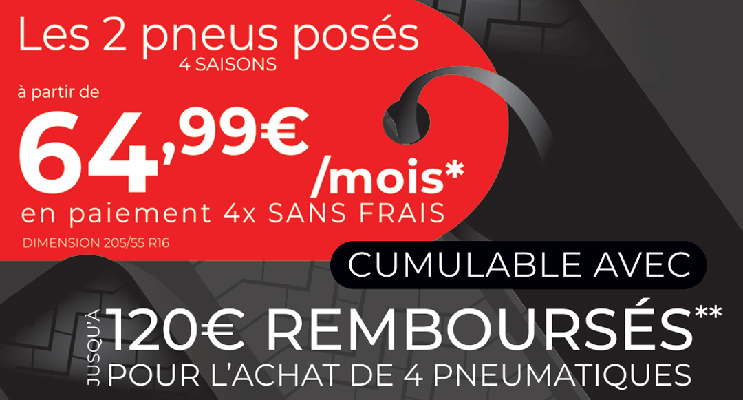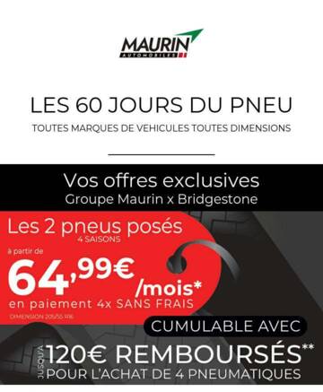* Offre de paiement 4 fois sans frais sous réserve d’accord FINANCO. 4 versements de 64,99€ correspondant à 2 pneus de marque 4 saisons 205/55 R16 TURAS6 94V XL TL (réf : BRI23902) posés à 259,96€ TTC incluant 39€ de pose et équilibrage et une remise de 35% par pneumatique (prix hors remise : 158,40€ TTC). Premier versement le jour de la facture puis 3 prélèvements à 30, 60 et 90 jours. L’offre de paiement 3 ou 4 fois par carte bancaire est proposée par FINANCO - Siège social : 335 rue Antoine de Saint-Exupéry - 29490 Guipavas - SA à Directoire et Conseil de surveillance au capital de 58 000 000€ - RCS Brest B 338 138 795 - Société de courtage d’assurance n°ORIAS 07 019 193 (www.orias.fr). Offre réservée aux particuliers, conditionnée à la pose, valable du 1er avril au 31 mai 2024 dans les concessions du Groupe Maurin participantes. Voir détails et conditions en concession. Un crédit vous engage et doit être remboursé. Vérifiez vos capacités de remboursement avant de vous engager. ** Offre de remboursement différé valable du 1er avril au 31 mai 2024. Voir conditions générales de vente sur : https://offre.bridgestone.fr/avril/.