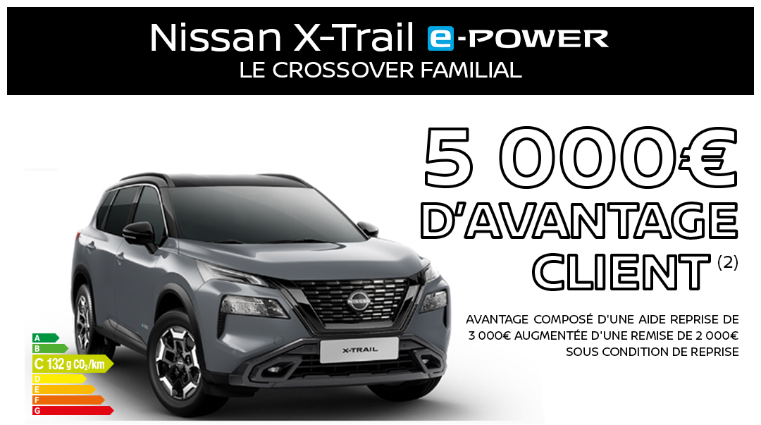 (2) Soit 3 000€ ajoutés à la valeur de reprise de votre véhicule suivant évaluation de votre concessionnaire, augmentés de 2 000€ de remise Nissan pour l’acquisition d’un Nissan X-TRAIL gamme 2024 neuf. Offre réservée aux particuliers, non cumulable avec d’autres offres en cours, valable jusqu’au 30/06/2024.Modèle présenté : Nissan X-Trail 2024 e-POWER 204ch N-Trek gamme 2024 neuf avec option peinture métallisée spéciale bi-ton Gris Argile au prix de 48 600€.