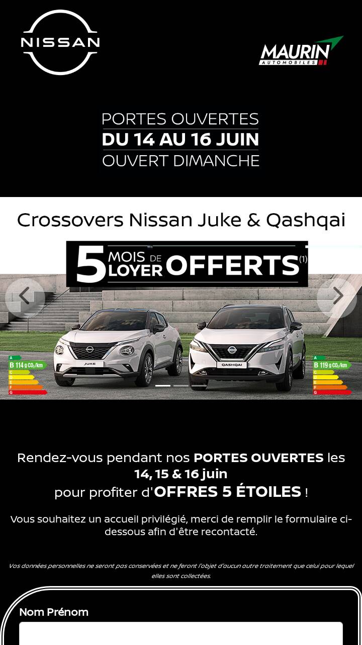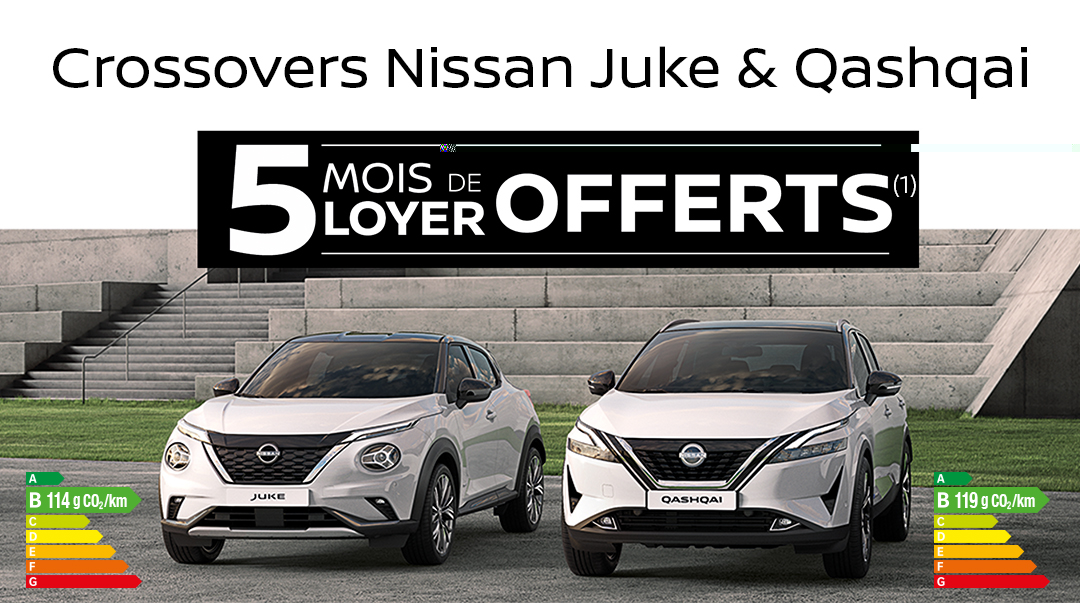 (1) 5 loyers offerts (2ème, 3ème, 4ème, 9ème et 10ème), dans le cadre d’une location longue durée pour Nissan Juke 2023.5 ou Qashqai 2022.5 neufs. Restitution du véhicule chez votre concessionnaire en fin de contrat avec paiement des frais de remise en état standard et des kilomètres supplémentaires. Offre réservée aux particuliers, non cumulable avec d’autres offres, valable jusqu’au 30/06/2024 avec une immatriculation jusqu’au 06/07/2024, sous réserve d’acceptation par DIAC, dans la limite des stocks disponibles, chez les concessionnaires Nissan participants. Modèles présentés : Versions spécifiques. NISSAN WEST EUROPE SAS : nissan.fr.