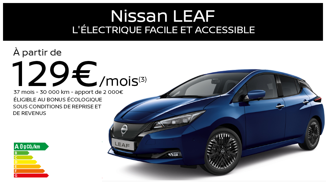 (3) Exemple pour une Nissan LEAF ACENTA 40kWh gamme 2022 neuve en Location Longue Durée sur 37 mois, 30 000 km maximum, 1er loyer de 10 500€, ramené à 2000€ après imputation du bonus écologique de 7 000€ et de la prime à la conversion de 1500€ puis 36 loyers de 129€.