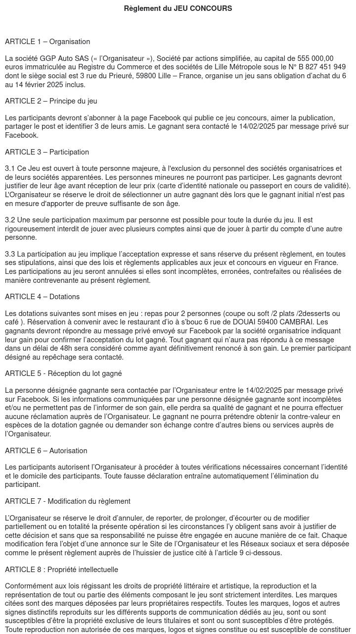 La société GGP Auto SAS (« l’Organisateur »), Société par actions simplifiée, au capital de 555 000,00 euros immatriculée au Registre du Commerce et des sociétés de Lille Métropole sous le N° B 827 451 949 dont le siège social est 3 rue du Prieuré, 59800 Lille – France, organise un jeu sans obligation d’achat du 22 janvier au 16 février 2026 inclus.
