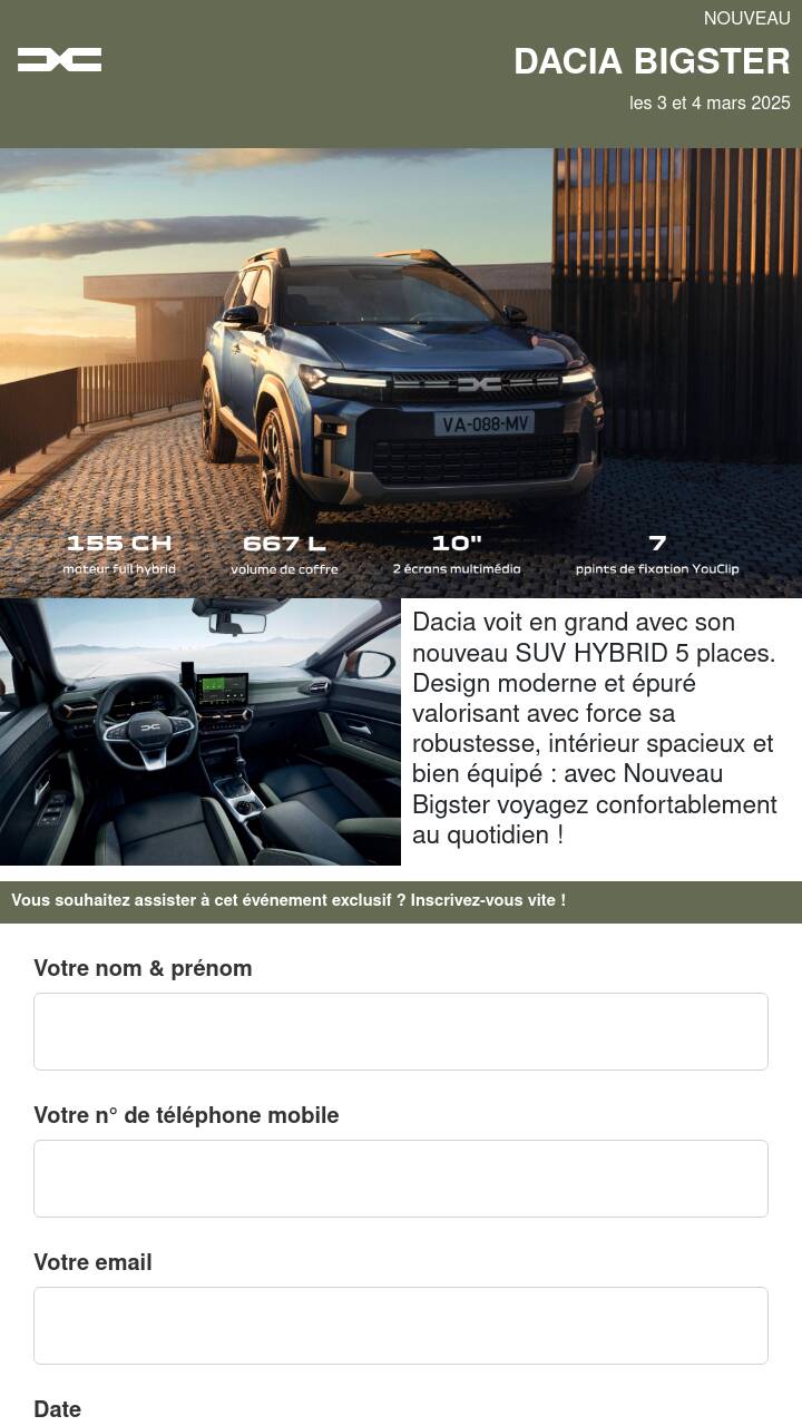 Dacia voit en grand avec son nouveau SUV HYBRID 5 places. Design moderne et épuré valorisant avec force sa robustesse, intérieur spacieux et bien équipé : avec Nouveau Bigster voyagez confortablement au quotidien !
