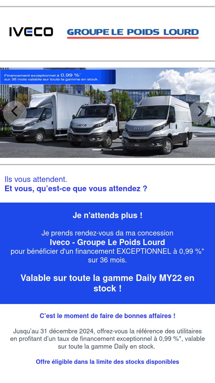 Jusqu’au 31 mars 2024, offrez-vous la référence des utilitaires en profitant d’un taux de financement exceptionnel à 0,99 %*, valable sur toute la gamme Daily en stock.