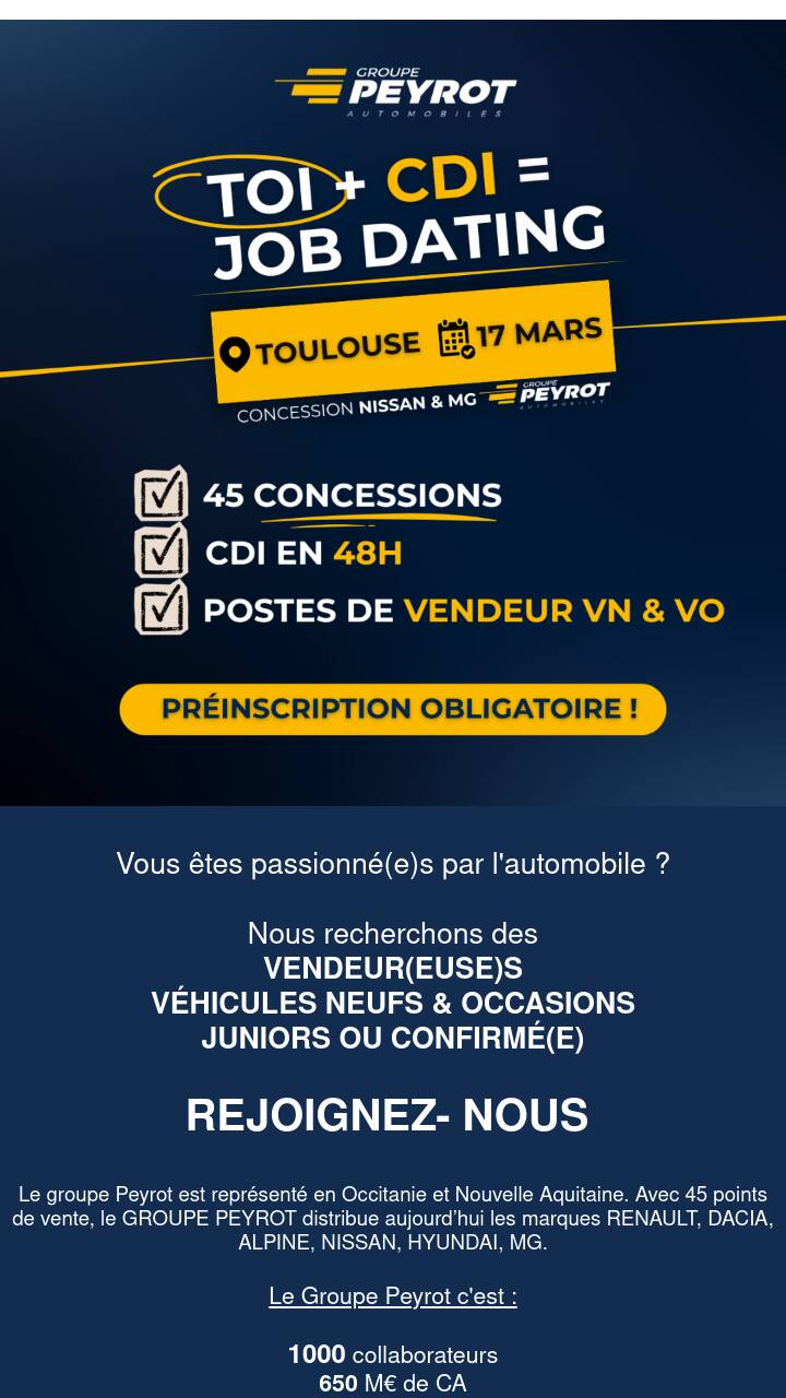 Le groupe Peyrot est représenté en Occitanie et Nouvelle Aquitaine. Avec 45 points de vente, le GROUPE PEYROT distribue aujourd’hui les marques RENAULT, DACIA, ALPINE, NISSAN, HYUNDAI, MG. Le Groupe Peyrot c'est : 1000collaborateurs 650 M€ de CA 30% de femmes 19000 véhicules neufs vendus par an