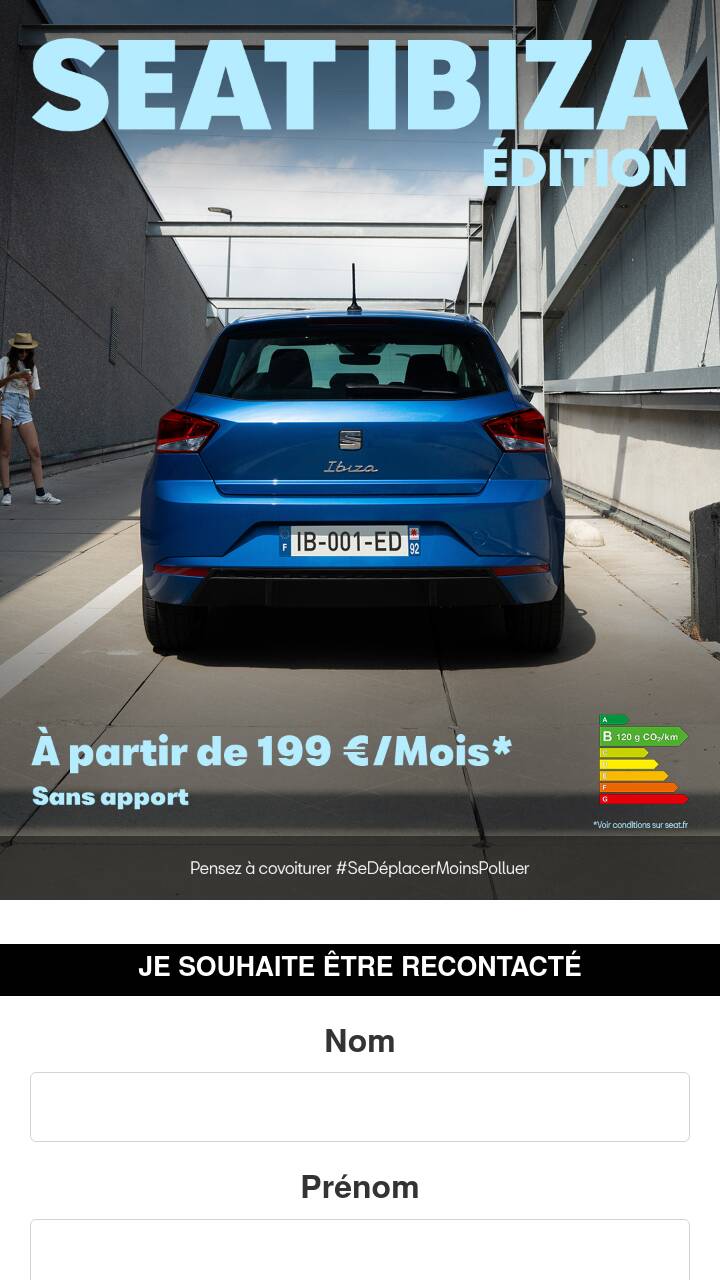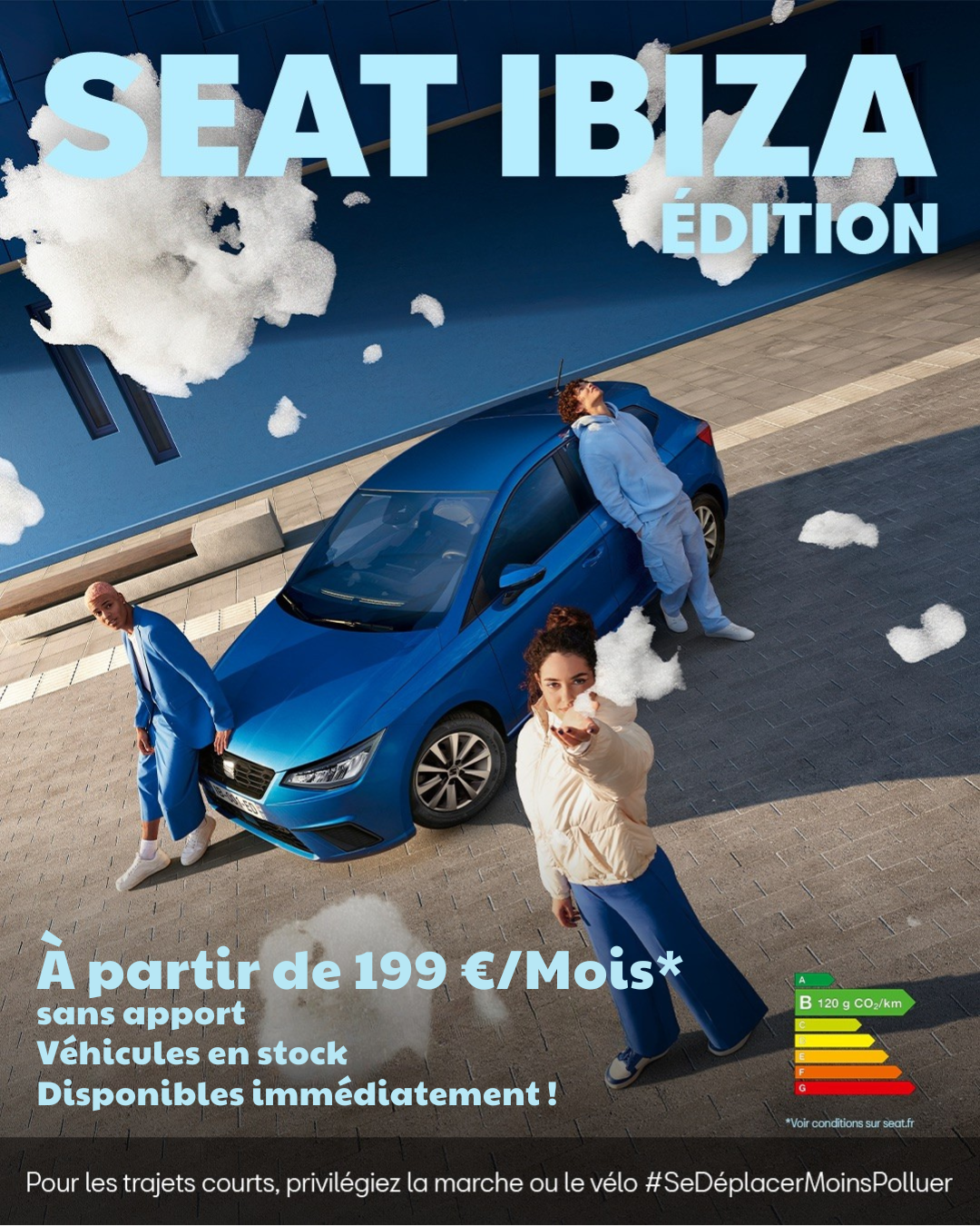 Location longue durée sur 37 mois. 37 loyers de 199 €. Déduction faite de l'offre de remise de 4700 €. Exemple pour une SEAT SEAT Ibiza Edition 1.0 MPI 80 ch BVM5 Start/Stop en location longue durée sur 37 mois et pour 30000 km maximum. consommation mixte WLTP (min-max l/100km) : 5,3-5,5. Émissions de CO2 WLTP (min – max g/km) : 120-120 Contrat d'entretien VIP souscrit auprès de Volkswagen Bank GmbH, coût mensuel de 8,1 € inclus dans les loyers Garantie 2 ans + 1 an de garantie additionnelle. consommation mixte WLTP (min-max l/100km) : 5,3-5,5. Émissions de CO2 WLTP (min – max g/km) : 120-120