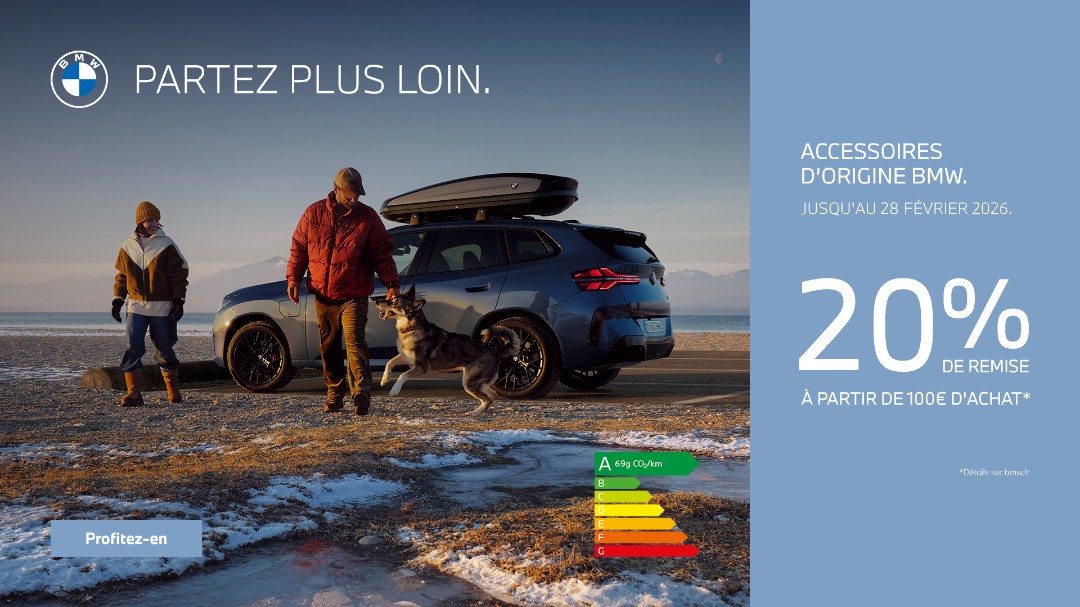 (1) Offre valable pour tout achat d’Accessoire(s) dans la gamme Accessoires d’Origine BMW, entre le 1er Novembre 2025 et le 28 Février 2026 inclus, d’un montant minimum de 100€TTC, hors frais de main d’oeuvre, non cumulable avec d’autres offres en cours. A partir de 100€TTC d’achat sur les Accessoires d’Origine BMW, tentez votre chance à notre jeu concours et retrouver le règlement du jeu sur bmw.fr. Offre réservée aux particuliers, valable chez les Partenaires BMW et réparateur Agréés BMW participants à l’opération en France métropolitaine et à Monaco dont la liste est accessible à l’adresse www.bmw.fr. BMW France, Société Anonyme à directoire et Conseil