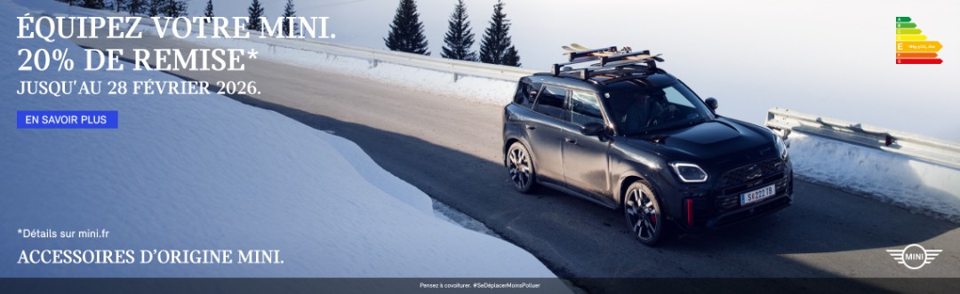 (2) Offre valable pour tout achat d’Accessoire(s) dans la gamme Accessoires d’Origine MINI, entre le 1er juin 2025 au 31 août 2025 inclus, d’un montant mini- mum de 100€TTC, hors frais de main d’œuvre, non cumulable avec d’autres offres en cours. A partir de 100€ TTC d’achat sur les Accessoires d’Origine MINI, tentez votre chance à notre jeu concours et retrouver le règlement du jeu sur mini.fr. Offre réservée aux particuliers, valable chez les Concessionnaires MINI et réparateur Agrées MINI participants à l’opération en France métropolitaine et à Monaco dont la liste est accessible à l’adresse www.mini.fr. MINI France, Société Anonyme à Directoire et Conseil de Surveillance au capital de 2.805.000€ - RCS Versailles 722 00 965 - 5, rue des Hérons - CS 20750 - 78182 Saint-Quentin-en-Yveline Cedex.