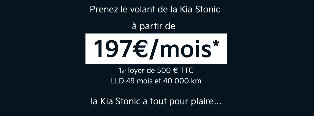 (1) Exemple de Location Longue Durée (LLD) de 49 mois et 40 000 km pour le financement d'un Kia Stonic Motion 1.0 essence T-GDi 100 ch ISG BVM6 (hors options). 1er loyer majoré de 500 € TTC puis 48 loyers mensuels de 197 € TTC. Sous condition de reprise. Exemple hors assurances et prestations facultatives. Modèle présenté : Kia Stonic GT-line 1.0 T-GDi 100 ch BVM6 avec peinture métallisée et systèmes avancés d'aides à la conduite. 1er loyer majoré de 500 € TTC puis 48 loyers mensuels de 257 € TTC. Sous condition de reprise. Exemple hors assurances et prestations facultatives.