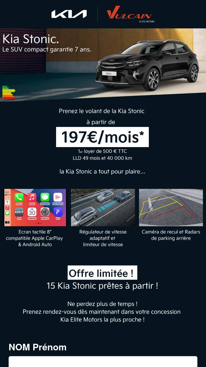 Offres réservées aux particuliers, non cumulables, valables du 01/07/2025 au 24/08/2025 chez les distributeurs Kia participant à l'opération. Dans la limite des stocks disponibles. Sous réserve d’acceptation du dossier par Kia Finance, Kia Finance est une marque exploitée par Hyundai Capital France, SAS au capital de 155 104 000 euros 69 avenue de Flandre 59700 Marcq-en-Baroeul SIREN 491 411 542 RCS Lille Métropole. Les marques citées appartiennent à leurs propriétaires respectifs. Voir conditions chez un distributeur Kia.