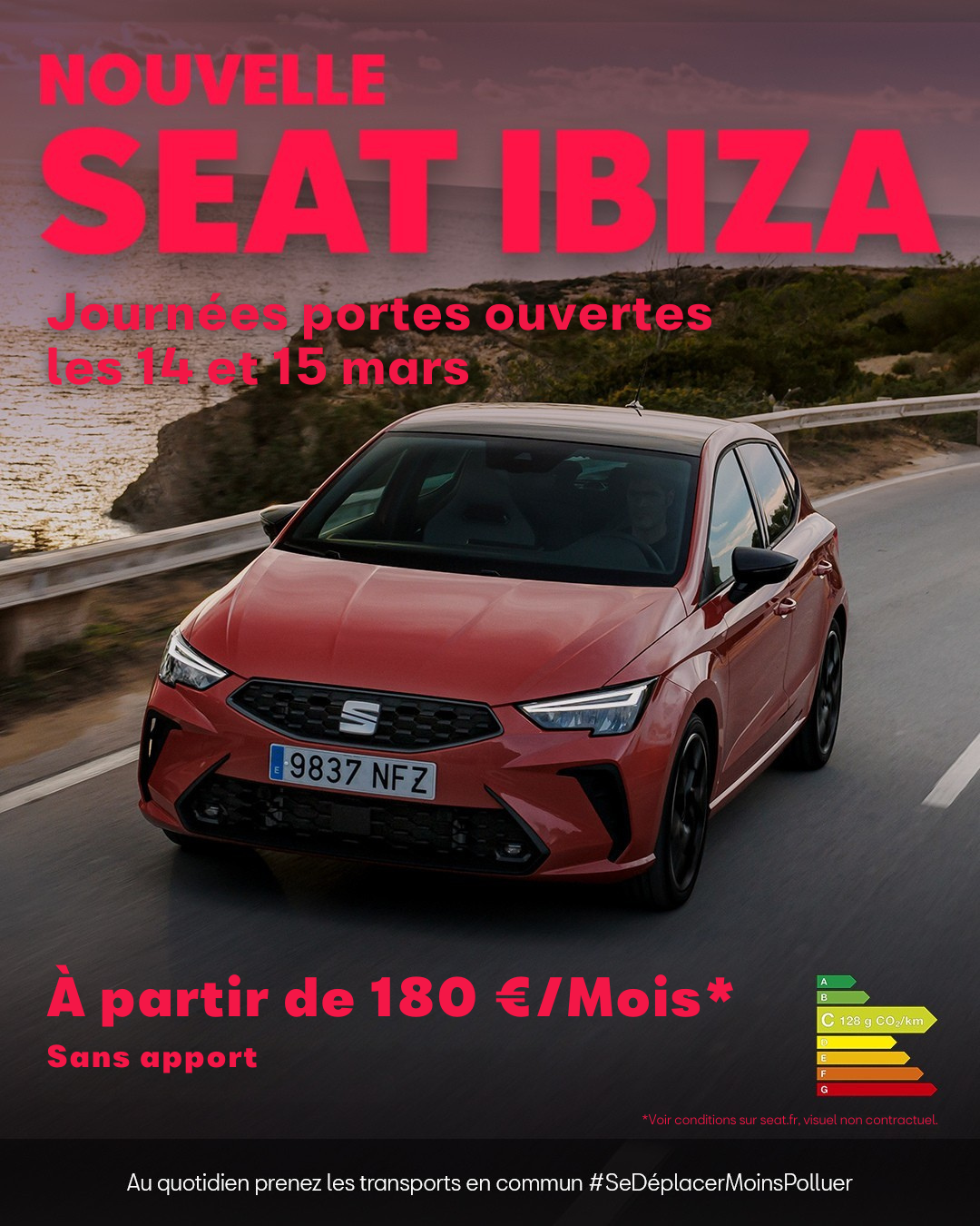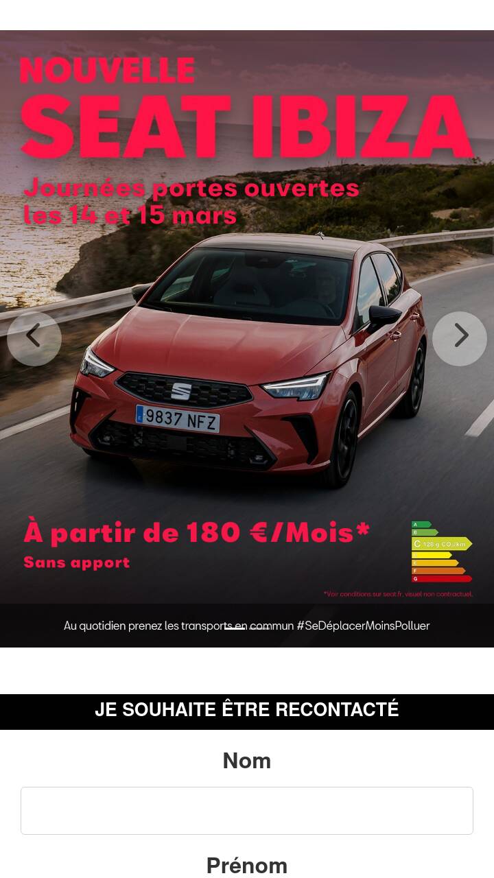 Location longue durée sur 37 mois. 37 loyers de 180 €. Déduction faite de l'offre de remise de 4700 €. Exemple pour une SEAT Ibiza COPA 1.0 MPI 80 ch BVM5 Start/Stop en location longue durée sur 37 mois et pour 30000 km maximum. consommation mixte WLTP (min-max l/100km) : 5,3-5,5. Émissions de CO2 WLTP (min – max g/km) : 120-120. (2) Contrat d'entretien VIP souscrit auprès de Volkswagen Bank GmbH, coût mensuel de 8,2 € inclus dans les loyers. (3) Garantie 2 ans + 1 an de garantie additionnelle. Offre réservée aux particuliers, non cumulable avec toute autre offre en cours, chez tous les Distributeurs SEAT (France métropolitaine) présentant ce financement et valable jusqu'au 31/03/2026 pour toute commande d'une SEAT Ibiza COPA 1.0 MPI 80 ch BVM5 Start/Stop passée avant le 31/03/2026 et livrée avant le 30/09/2026. Offre sous réserve d'acceptation du dossier VOLKSWAGEN BANK GMBH - SARL de droit allemand - Capital social : € 318 279 200 - Siège social : Braunschweig (Allemagne) - RC/HRB Braunschweig : 1819 - Intermédiaire d'assurance européen : D-HNQM-UQ9MO-22 (www.orias.fr) - Succursale France : Bâtiment Ellipse, 15 avenue de la Demi-Lune - 95700 Roissy-en-France - RCS Pontoise : 451 618 904 - Administration et adresse postale : 11, avenue de Boursonne - B.P. 61 - 02601 Villers-Cotterêts Cedex