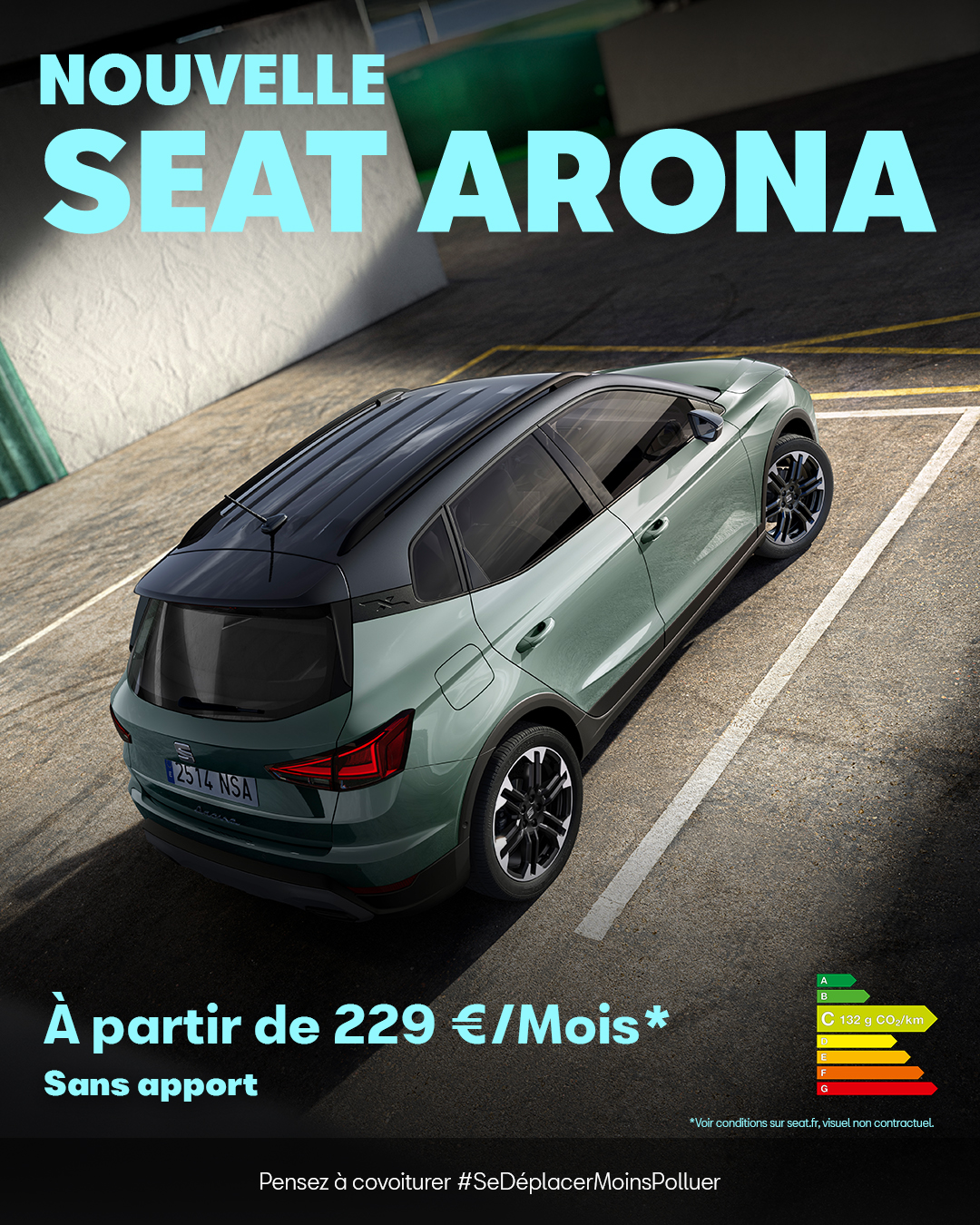 Location longue durée sur 37 mois. 37 loyers de 229 €. Déduction faite de l'offre de remise de 5000 €. Exemple pour une Seat Arona Copa 1.0 TSI 95 ch BVM5 START/STOP en location longue durée sur 37 mois et pour 30000 km maximum. consommation mixte WLTP (min-max l/100km) : 5,5 - 5,8. Émissions de CO2 WLTP (min – max g/km) : 124 - 130. (2) Contrat d'entretien VIP souscrit auprès de Volkswagen Bank GmbH, coût mensuel de 8,2 € inclus dans les loyers. (3) Garantie 2 ans + 1 an de garantie additionnelle. Offre réservée aux particuliers, non cumulable avec toute autre offre en cours, chez tous les Distributeurs SEAT (France métropolitaine) présentant ce financement et valable jusqu'au 31/03/2026 pour toute commande d'une Seat Arona Copa 1.0 TSI 95 ch BVM5 START/STOP passée avant le 31/03/2026 et livrée avant le 30/09/2026. Offre sous réserve d'acceptation du dossier VOLKSWAGEN BANK GMBH - SARL de droit allemand - Capital social : € 318 279 200 - Siège social : Braunschweig (Allemagne) - RC/HRB Braunschweig : 1819 - Intermédiaire d'assurance européen : D-HNQM-UQ9MO-22 (www.orias.fr) - Succursale France : Bâtiment Ellipse, 15 avenue de la Demi-Lune - 95700 Roissy-en-France - RCS Pontoise : 451 618 904 - Administration et adresse postale : 11, avenue de Boursonne - B.P. 61 - 02601 Villers-Cotterêts Cedex