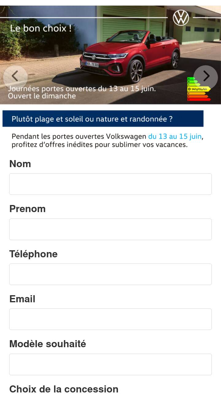 Volkswagen Donjon Automobiles est responsable du traitement de vos données. Concernant la durée de conservation de vos données personnelles, nous vous informons que nous appliquons la recommandation de la CNIL : 3 ans à compter du dernier contact pour les prospects ou 3 ans à compter de la fin de la relation contractuelle pour les clients. Vos données personnelles pourront être utilisées par Donjon Automobiles , VOLKSWAGEN Group France, ses filiales, son réseau et toute société du Groupe Volkswagen AG et d’éventuels partenaires commerciaux afin, dans tous les cas, de fournir un service de qualité adapté à vos besoins, ou dans le cadre d’opérations commerciales et marketing, y compris par e-mail si vous avez donné votre accord. Conformément au règlement n° 2016/679, dit règlement général sur la protection des données (RGPD), nous vous rappelons que vous bénéficiez d'un droit d'accès, de rectification, d’opposition, de radiation et de portabilité des informations vous concernant ainsi que de demander la limitation de leur traitement. Vous pouvez exercer ces droits en écrivant à l’adresse email suivante : [email protected], ou à l’adresse postale suivante : 107 route de corbeil 91700 Sainte Geneviève des Bois, accompagné d’une copie d’un titre d’identité. Vous disposez également du droit d’introduire une réclamation auprès d’une autorité de contrôle.