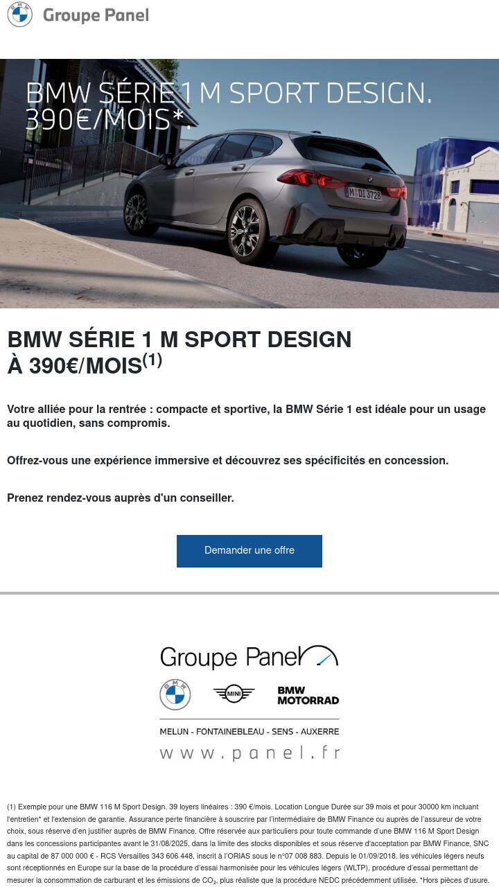 Location Longue Durée sur 39 mois et pour 30000 km incluant l'entretien* et l'extension de garantie. Assurance perte financière à souscrire par l’intermédiaire de BMW Finance ou auprès de l’assureur de votre choix, sous réserve d’en justifier auprès de BMW Finance. Offre réservée aux particuliers pour toute commande d’une BMW 116 M Sport Design dans les concessions participantes avant le 30/11/2025, dans la limite des stocks disponibles et sous réserve d'acceptation par BMW Finance, SNC au capital de 87 000 000 € - RCS Versailles 343 606 448, inscrit à l’ORIAS sous le n°07 008 883. Depuis le 01/09/2018, les véhicules légers neufs sont réceptionnés en Europe sur la base de la procédure d’essai harmonisée pour les véhicules légers (WLTP), procédure d’essai permettant de mesurer la consommation de carburant et les émissions de CO₂, plus réaliste que la procédure NEDC précédemment utilisée. *Hors pièces d'usure.