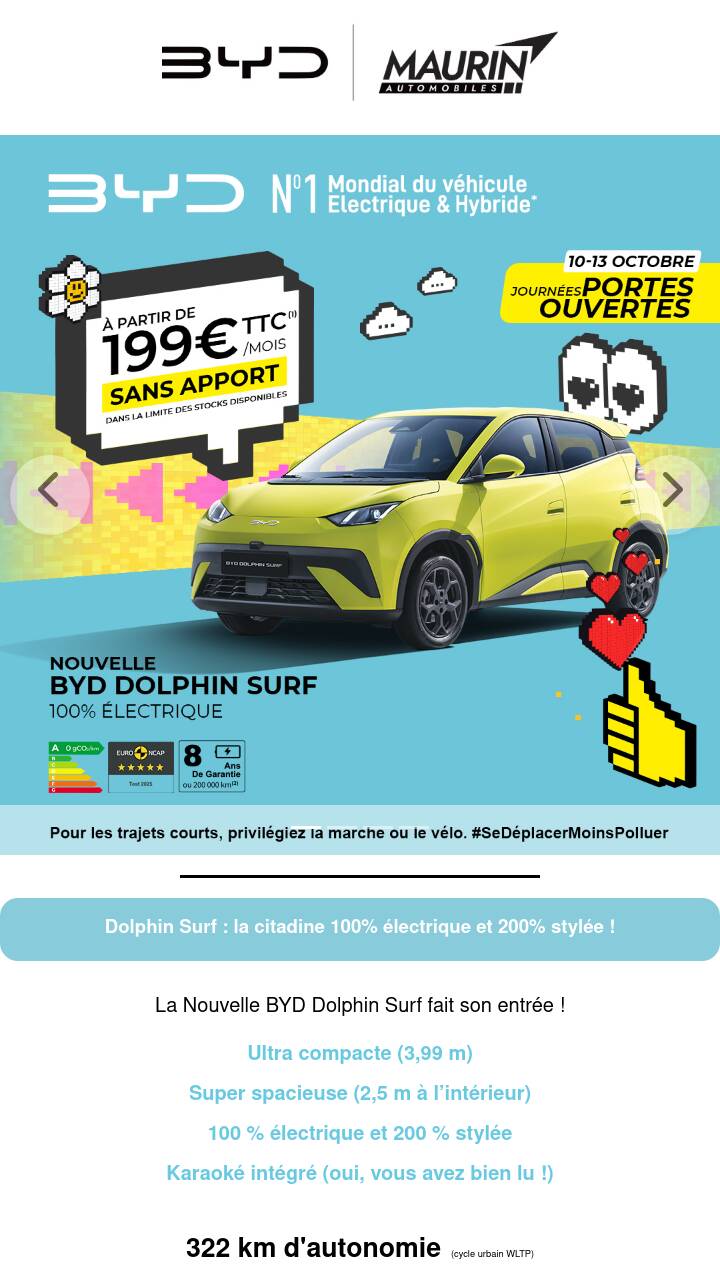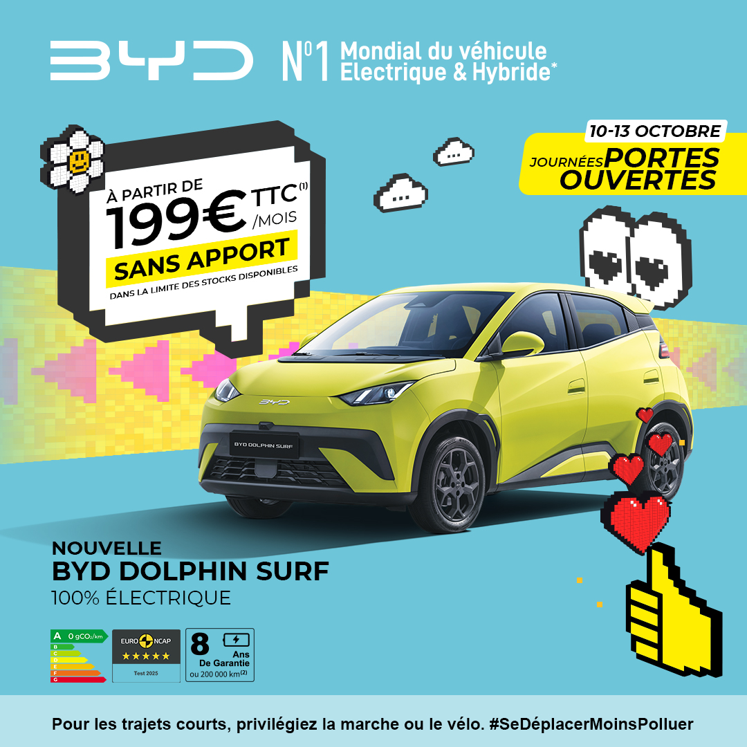 (1) BYD DOLPHIN Surf Active, à partir de 199 euros/Mois, LLD 49 mois 10 000 km par an, sans apport.