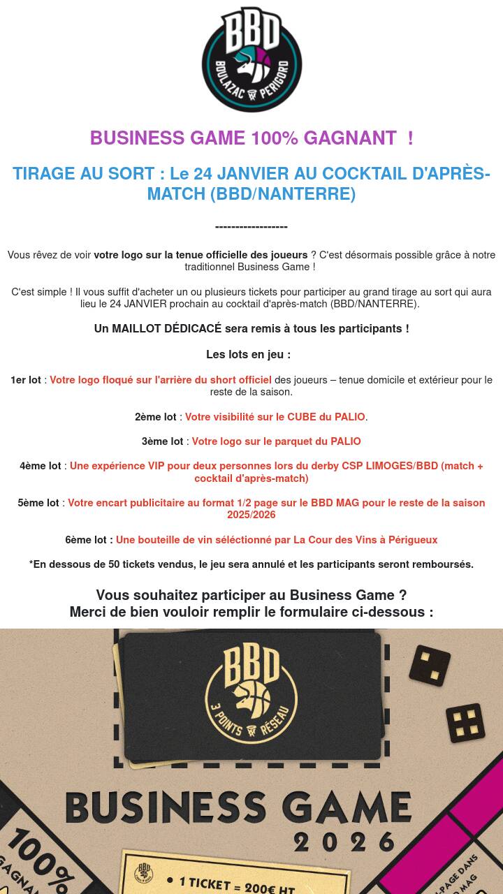5ème lot : Votre encart publicitaire au format 1/2 page sur le BBD MAG pour le reste de la saison 2025/2026